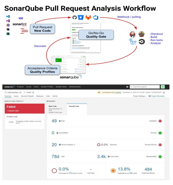 Chất lượng mã nguồn và kiểm soát bảo mật được tích hợp và liên tục kiểm tra trong suốt các Pipelines CI/CD. SonarQube đóng vai trò là một phần của quy trình kiểm thử trong giai đoạn CI. Khi mã nguồn được quét qua SonarQube, SonarQube sẽ đánh giá và đưa ra kết quả dựa trên các quy tắc được xác định trước của SonarQube. Kết quả đánh giá sau đó sẽ được gửi qua một cổng thông tin gọi là Quality Gate để đánh giá mã nguồn dựa trên các tiêu chí và điều kiện do tổ chức đặt ra. Nếu mã nguồn không đáp ứng các tiêu chuẩn chất lượng, Quality Gate sẽ chặn mã nguồn được phát hành và Nhà phát triển sẽ phải xử lý các lỗi được SonarQube tìm thấy và sau đó thực hiện quét lại từ đầu. Chi tiết về Quality Gate có thể được tìm thấy tại đây.
